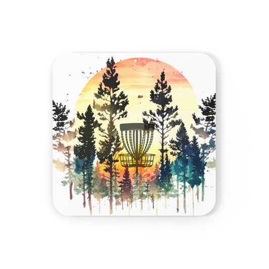 Disc Golf Basket Forest Sunset Corkwood Coaster Set